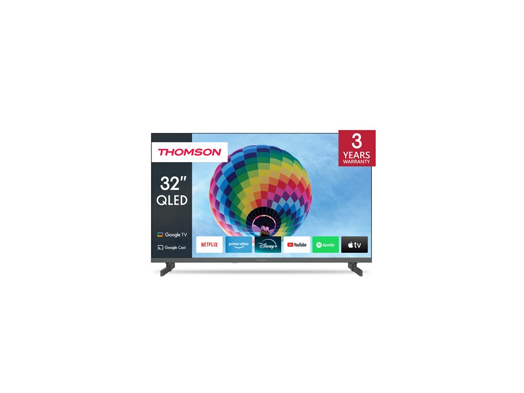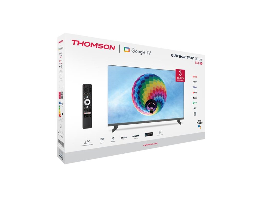 Inovujte svoju domácu zábavu pomocou Thomson Google TV 32” QLED XS. Displej QLED poháňaný nanokryštálmi Quantum Dot poskytuje vyvážený jas, výrazné kontrasty a rozšírený rozsah farieb. To všetko v jasnom a presnom obraze FHD TV. Vďaka elegantnému bezrámovému dizajnu sa môžete plne sústrediť na dianie na obrazovke. Technológia Dolby Audio vytvára dynamický zvukový zážitok. Google TV zjednodušuje váš zážitok zo zábavy organizovaním obsahu z vašich aplikácií a odberov. Vytvorte si viacero používateľských profilov a profitujte z vybraných odporúčaní. Vychutnajte si širokú škálu inteligentných funkcií, ako je prístup k viac ako 400 000 filmom a televíznym reláciám, inteligentné hlasové ovládanie pomocou Google Assistant a Google Cast na streamovanie obsahu z kompatibilných inteligentných zariadení do vášho televízora. Ergonomický diaľkový ovládač s plynulým podsvietením vám umožní mať všetko na očiach aj pri slabom osvetlení. Rýchly prístup k vašej obľúbenej aplikácii pomocou tlačidla FAVORITE. Integrovaný Google Assistant vám umožňuje intuitívne ovládať televízor pomocou hlasových príkazov. Vyhľadajte svoje obľúbené filmy, požiadajte o odporúčania na základe svojej nálady alebo ovládajte kompatibilné inteligentné zariadenia – to všetko pohodlne pomocou hlasu. Vstavaný trojitý tuner umožňuje príjem cez satelitnú anténu, pozemnú anténu alebo kábel. Takže môžete prijímať všetky dostupné kanály bez ďalšieho hardvéruDodatočné parametre