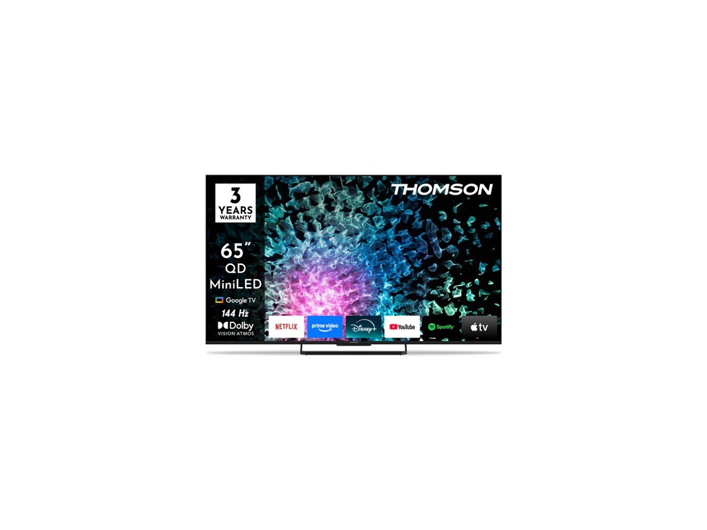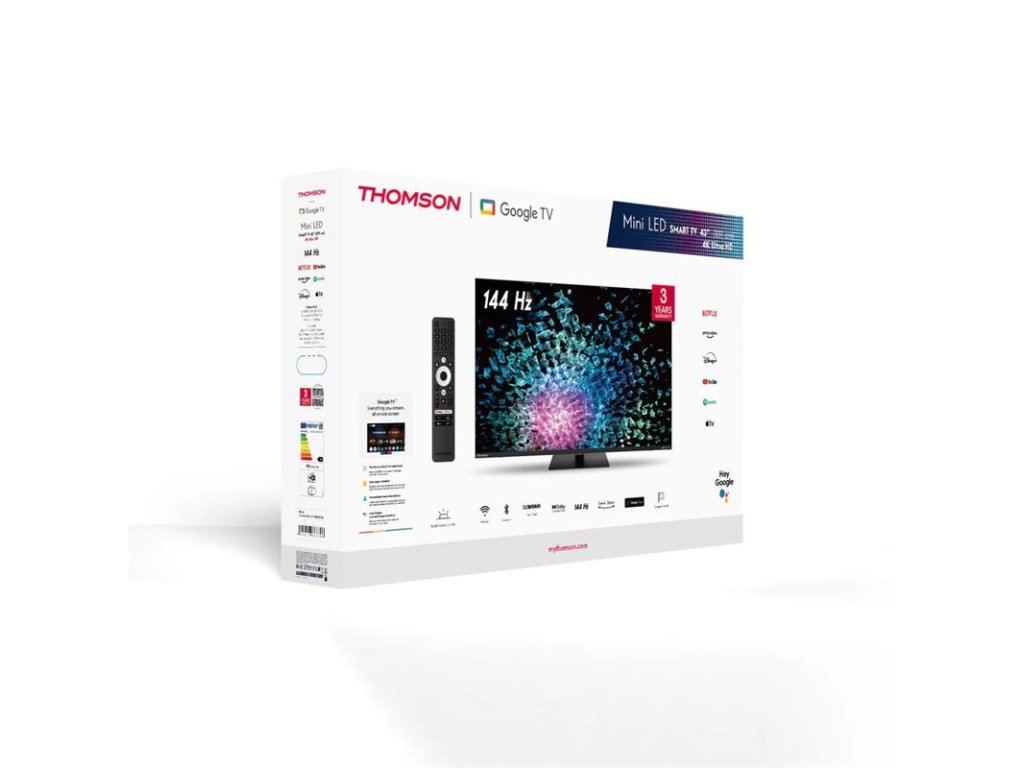 Premeňte svoju obývačku s televízorom Thomson Mini LED Google TV s uhlopriečkou 43", ktorý je navrhnutý tak, aby poskytoval úžasný obraz, bohatý zvuk a pohodlie inteligentnej zábavy v jednom elegantnom balení. Vďaka pokročilému podsvieteniu Mini LED poskytuje tento televízor neuveriteľný kontrast s hlbokou čiernou a jasnými svetlými odtieňmi. Technológia Quantum Dot zvyšuje presnosť farieb a vytvára živé a realistické tóny v širokom farebnom spektre. V kombinácii s rozlíšením 4K Ultra HD a Dolby Vision HDR je každá scéna ostrejšia, jasnejšia a detailnejšia – či už sledujete trháky, živé športové prenosy alebo svoje obľúbené streamované relácie. Vďaka obnovovacej frekvencii 144 Hz zostáva pohyb ostrý a plynulý. Rýchla akcia, hranie hier alebo vysokorýchlostné športy vyzerajú ultra plynule s minimálnym rozmazaním, čo vám poskytne výhodu v každom zábere. Tento inteligentný televízor s technológiou Google TV organizuje obsah zo všetkých vašich aplikácií a predplatných na jednom mieste. Objavte viac ako 400 000 filmov a relácií, vytvorte si prispôsobené profily pre členov rodiny a vychutnajte si odporúčania prispôsobené vašim diváckym zvykom. Pre jednoduché hlasové ovládanie použite vstavaného Asistenta Google alebo okamžite prenášajte obsah z telefónu alebo tabletu pomocou služby Google Cast. Vychutnajte si zvuk, ktorý sa okolo vás pohybuje. Tento televízor ponúka podporu pre Dolby Atmos, takže akékoľvek kompatibilné zvukové zariadenia vytvárajú trojrozmernú zvukovú scénu, ktorá zvyšuje čistotu dialógov a vtiahne vás hlbšie do deja – či už ide o film, hru alebo živý koncert. Thomson Mini LED TV nie je len o výkone – je navrhnutý tak, aby sa prispôsobil vášmu priestoru. Centrálny otočný stojan zvyšuje flexibilitu a umožňuje vám nastaviť uhol obrazovky pre dokonalý pohľad. Jeho štíhly, minimalistický profil sa bez problémov hodí do moderných interiérov. Podsvietený ergonomický diaľkový ovládač uľahčuje navigáciu v menu, a to aj pri slabom osvetlení. Či už sledujete filmy, hráte hry alebo streamujete svoje obľúbené programy, tento televízor je navrhnutý tak, aby poskytoval vyvážený a pohlcujúci zážitok z domácej zábavyDodatočné parametre