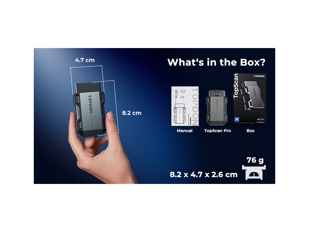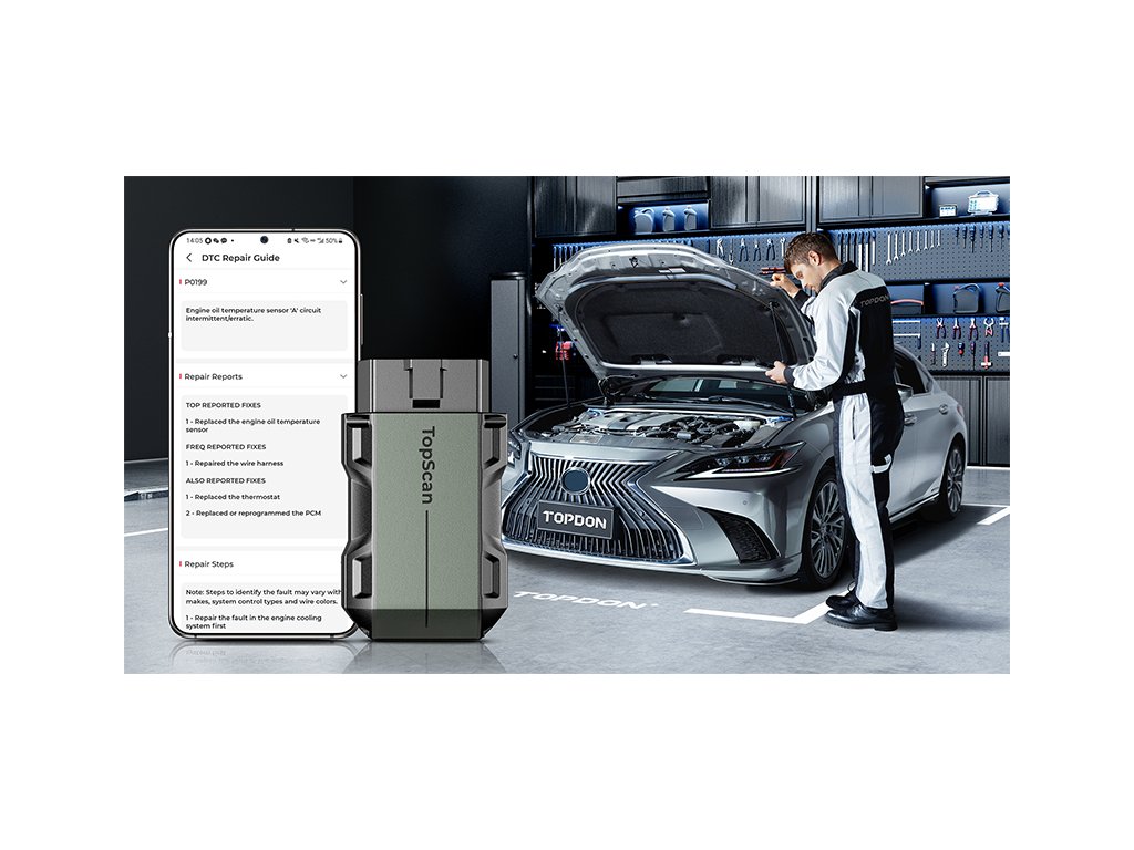 TopScan Pro - je kapesní diagnostické zařízení, které promění váš telefon ve skenovací nástroj a drží krok se svými uživateli, kteří překračují rámec základního skenování. Připojte TopScan Pro k portu OBD2 a začněte diagnostikovat prostřednictvím aplikace pro Android i iOs Aplikace v češtině • 13 speciálních funkcí • možnost IMMO • Záznamy o opravách • Diagnostické reporty • Plná diagnostika systému motoru, převodovky, airbagu atd. • funkce OBD2 • AutoVIN • Funkce obousměrného řízení • Bluetooth • Test výkonu vozidla TOPDON TopScan Pro - diagnostický skener pro vozidla TopScan Pro vyniká v mnoha věcech. Dokáže číst a vymazávat chybové kódy a podporuje více než 70 různých značek vozidel z Ameriky, Asie a Evropy. Jeho systém poskytuje komplexní znalostní databázi údržby, která umožňuje rychle začít s opravami automobilů. Přístup k 8 službám údržby, technologii AutoVIN, testování výkonu vozidla a dokonce i k obousměrnému ovládání prostřednictvím telefonu. Mezi další výhody systému TopScan Pro patří průvodce opravami DTC v celém systému a připravenost k I/M jedním kliknutím. Upozornění pro uživatele: TOPDON TopScan Pro je profesionální diagnostický skener, který vyžaduje určité technické znalosti a zkušenosti uživatele s podobným typem zařízení. Vzhledem k jeho pokročilým funkcím, může být obsluha náročná pro uživatele bez předchozí zkušenosti s automobilovou diagnostikou. Před koupí tohoto zařízení se prosím důkladně seznamte s uživatelským manuálem, abyste se vyhnuli případnému poškození Vašeho vozidla v důsledku neodborné manipulace s TopScan Pro, nebo vracení použitého produktu zpět do obchodu. Také si před koupí ověřte, zda TOPDON TopScan Pro podporuje i vaši značku vozidla. Kompletní diagnostika systému pro více než 70 značek Skener TopScan Pro umožňuje uživateli provádět komplexní skenování všech systémů vozidla včetně motoru, převodovky, airbagů, ABS, ESP, TPMS, imobilizéru, brány, řízení, rádia a klimatizace u více než 70 značek. Průvodce opravou DTC TopScan Pro nabízí průvodce opravou DTC, který vás provede procesy a kódy diagnostiky vozidla. Po načtení chybových kódů dokáže TopScan Pro zobrazit definici chybových kódů a nabídnout návod, jak je opravit. Obsahuje definice chybových kódů pro všechny systémy, jako je přístrojová deska, klimatizace a další. V současné době je přístroj TopScan Pro kompatibilní i s vozy Chrysler/Dodge/Jeep/Fiat 2010-2014 (kompatibilita se rozšiřuje s vydáváním aktualizací). Získejte všechna data OBD2 Přístroj TopScan Pro od společnosti TOPDON funguje jako čtečka kódů OBD2 a provádí všech 10 režimů testování OBD2 zdarma po celou dobu životnosti, což vám umožní přístup k důležitým informacím o ještě více vozidlech. Podporuje také všechny funkce, včetně čtení DTC, vymazání DTC, živých dat, stavu monitoru připravenosti I/M, zobrazení dat Freeze Frame, testování snímače O2, testování palubního monitoru, testování výparů, čtení informací o vozidle a vyhledávání DTC. Bezproblémové obnovení provozu vašeho vozu Všimli jste si kontrolky údržby? Nebojte se - naše funkce resetování oleje vám kryje záda! TopScan Pro hrdě představuje komplexní sadu 13 funkcí resetování: Reset oleje, přizpůsobení plynu, reset EPB, reset úhlu řízení a další. . Diagnostikujte své vozidlo, vyřešte výstražné kontrolky. Obousměrná kontrola Skener TopScan Pro může získat přístup k subsystémům a součástkám specifickým pro vozidlo. Tím se určí integrita systému nebo dílů, což uživatelům umožňuje analyzovat a přesněji lokalizovat vadné díly. Včetně vstřikovačů paliva, čerpadel chladicí kapaliny, oken, stěračů a dalších. Knihovna dat o opravách TopScan Pro poskytuje komplexní znalostní databázi údržby, která začátečníkům pomůže rychle se seznámit s diagnostikou vozidla. Skvělá funkce pro kutily, kteří chtějí ušetřit peníze a vyřešit drobné problémy s vozidlem. Informace o opravách zahrnují průvodce opravami DTC, technický servisní bulletin, umístění DLC a knihovnu výstražných světel. Klíč k novému byznysu Krok za hranice diagnostiky. Zapojte programování klíčů a nabídněte rozšířené služby. Tento nástroj pro programování klíčů vám ulehčí mnoho starostí. Naprogramujte si počet klíčů, funkce klíčů a vyřešte i problém se ztrátou klíčů. Ať už jste zámečník nebo opravář, tento nástroj nejen splní vaše potřeby, ale překoná je a otevře vám nové možnosti pro rozšíření vašeho podnikání. Co ještě umí TopScan Pro? Zobrazení datových toků ve formě textu, grafu nebo grafu podobného přístrojovému panelu. To pomáhá uživatelům intuitivně sledovat změny dat v čase. Použití funkce ''Kombinovat'' pro grafické zobrazení až 4 datových toků v jednom rozhraní umožňuje uživatelům vyhodnocovat výkonnost pomocí srovnávacích dat a dělat přesná a efektivní rozhodnutí. Analýza oxidu uhličitého Skener TopScan Pro obsahuje tlačítko připravenosti I/M pro rychlou kontrolu stavu smogové situace a generuje zprávy o testování. Díky této funkci mohou uživatelé kdykoli a kdekoli rychleji a efektivněji analyzovat emise oxidu uhličitého ve vozidle. Vhodné pro předběžné testy emisí při ročních prohlídkách a namátkové testy na silnici. Klíčové vlastnosti •Aplikace v češtině •13 speciálních funkcí (reset oleje, reset BMS, odvzdušnění ABS atd.) a možnost IMMO •Knihovna údajů o opravách •Generování diagnostických zpráv •Plná diagnostika systému motoru, převodovky, airbagu atd. •Úplné funkce OBD2 (čtení a vymazání chybových kódů, čtení údajů ze z