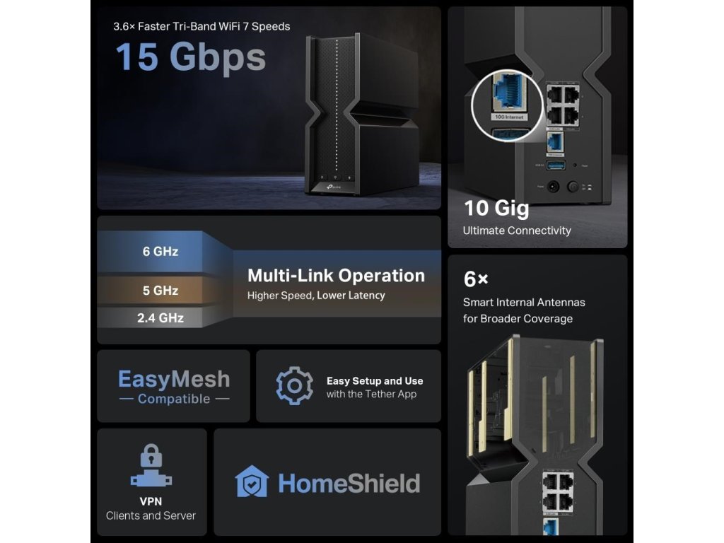 - Trípásmová Wi-Fi s bleskovou rýchlosťou 15 Gb/s: Wi-Fi 7 naplno využíva potenciál pásma 6 GHz s kanálmi až 320 MHz a rýchlosťou Wi-Fi 11,5 Gb/s. Užívajte si plný prístup ku streamovaniu v rozlíšení 8K a vysokorýchlostnému sťahovaniu.
