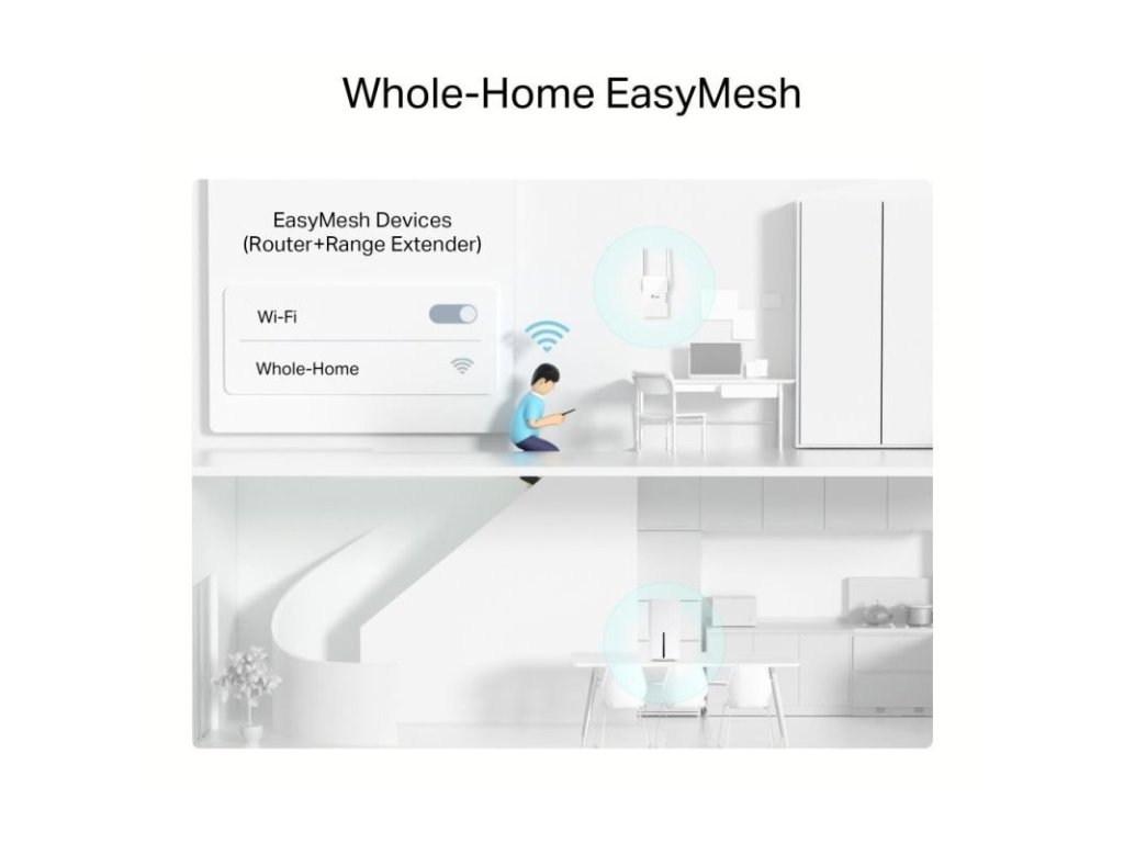 Kompatibilný s EasyMesh - Spolupracuje s produktmi EasyMesh, čo umožňuje vytvoriť cenovo dostupnú a flexibilnú mesh sieť s jednotným názvom Wi-Fi, ktorá pokryje celú domácnosť.