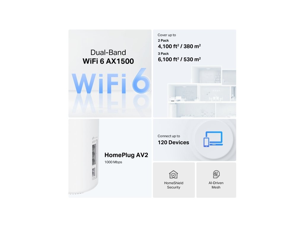 TP-Link Deco PX10 kombinuje Wi-Fi 6 AX1500 a Powerline AV1000 pro spolehlivou síť po celé domácnosti. Díky inteligentnímu AI Mesh, průchodu signálu zdmi a gigabitovým portům získáte vysokorychlostní, stabilní a bezpečnou konektivitu pro každé zařízení. Bezdrátová síť * Standard: Wi-Fi 6 (IEEE 802.11ax) * Tri-Band Wi-Fi AX1500: 5 GHz: až 1201 Mb/s, 2,4 GHz: až 300 Mb/s * Technologie Powerline: HomePlug AV2 1000 Mb/s – stabilní síť přes elektrické vedení * Pokrytí: 4–6+ pokojové domy (3-pack) * Mesh technologie: AI-Driven Mesh – inteligentní optimalizace sítě * Antény: 2× dvoupásmové antény * Technologie: MU-MIMO, OFDMA Porty a hardware * Ethernet: 3× Gigabit porty (WAN/LAN auto-sensing) * Tlačítka: Reset Režimy provozu * Router Mode * Access Point Mode Zabezpečení * Firewall: SPI Firewall * Šifrování Wi-Fi: WPA/WPA2/WPA3 * HomeShield: Ochrana IoT zařízení, rodičovská kontrola, blokování škodlivých stránek, prevence DDoS * Guest Network: 5 GHz a 2,4 GHz Software a správa * Protokoly: IPv4, IPv6 * Správa: Deco App (iOS/Android), web (HTTP/HTTPS) * Porty pro správu: 22, 20001, 30001 TCP, 20002 UDP * QoS: HomeShield QoS – prioritizace zařízení * Cloudové služby: OTA Firmware Upgrade, TP-Link ID, DDNS Provozní podmínky * Provozní teplota: 0 °C až 40 °C * Skladovací teplota: -40 °C až 60 °C * Provozní vlhkost: 10 % až 90 % RH * Skladovací vlhkost: 5 % až 90 % RH Fyzické parametry * Rozměry (Š × D × V): 105 × 105 × 169 mm Obsah balení * 3-pack: 3× Deco PX10 jednotky, 1× RJ45 kabel, 3× napájecí kabel, Quick Installation Guide Odkaz na web výrobce: https://www.tp-link.com/cz/home-networking/deco/deco-px10/Dodatočné parametre