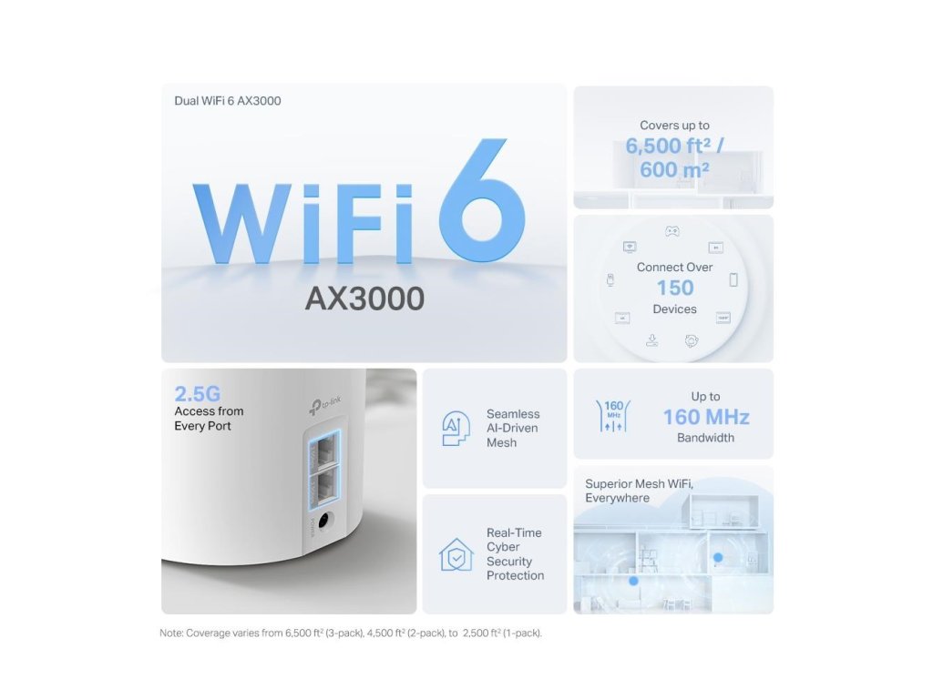| WiFi Rozsah | 4-6+ Bedroom Houses (3-pack) TP-Link Mesh technológia Voliteľné Ethernetové backhaul spojenie spolupracuje na prepojení Deco jednotiek, aby zabezpečilo plynulé pokrytie AI-Driven Mesh Inteligentne sa učí prostredie siete, aby poskytoval ideálne Wi-Fi jedinečné pre váš domov 3× Antény (vnútorné) Mnohé antény tvoria signál zosilňujúce pole na pokrytie väčšieho množstva smerov a veľkých oblastí |