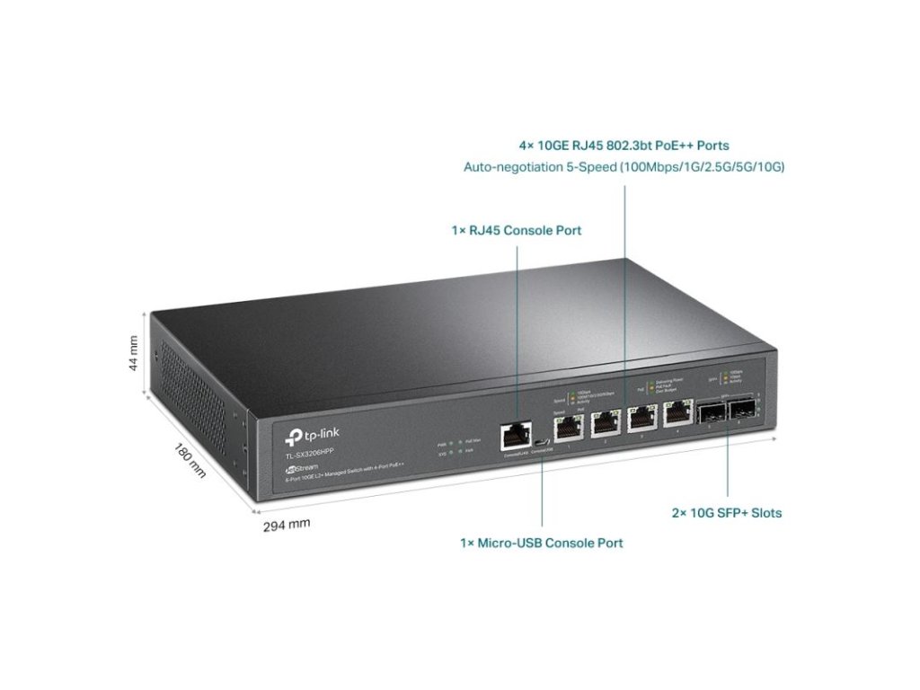 TL-SX3206HPP JetStream 6-Port 10GE L2+ manažovateľný switch s 4-Port PoE++. 10G rýchle pripojenie, 4x 10 Gbps RJ45 portami a 2x 10 Gbps SFP+ slotmi. Výstup PoE++ s rozpočtom na napájanie 200 W (60W na jeden port): Štyri porty 802.3af/at/bt PoE++ 10G s výstupom PoE až 60 W na každom porte sú ideálne pre nasadenie Omada WiFi 6 a WiFi 6E AP. Bohaté funkcie L2 a L2+: Podporuje kompletný rad funkcií L2 a L2+, vrátane statického smerovania, QoS na podnikovej úrovni a IGMP Snooping. Robustné bezpečnostné stratégie : Podporuje kompletný rad funkcií L2 a L2+ vrátane statického smerovania, QoS na podnikovej úrovni a IGMP Snooping. Statické smerovanie : Pomáha smerovať interný prenos pre efektívnejšie využitie sieťových zdrojov. Centralizovaná správa cloudu : Integruje sa do Omada SDN pre cloudový prístup a vzdialenú správu. Samostatná správa : Web, CLI (konzolový port, Telnet, SSH), SNMP, RMON a duálny obraz prinášajú výkonné možnosti správy.