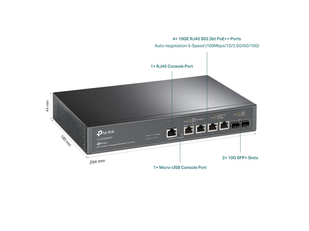 6portový řízený switch JetStream 10GE L2+ se 4 PoE++ porty TL-SX3206HPP *Bleskurychlé připojení s plnou 10G rychlostí: Nabízí připojení s velkou šířkou pásma pomocí čtyř 10Gbit/s RJ45 portů a dvou 10Gbit/s SFP+ slotů. *Napájení PoE++ s výstupním výkonem až 200 W: Čtyři 10G RJ45 porty podporující 802.3af/at/bt PoE++ napájení až 60 W na port jsou ideální pro nasazení přístupových bodů Omada WiFi 6 a WiFi 6E. *Multi-Gigabitové sítě: 10G RJ45 porty podporují 5 rychlostí připojení (100M/1G/2,5G/5G/10G) a SFP+ sloty lze osadit 10G i 1G transceivery *Pokročilé L2 a L2+ funkce: Podporuje kompletní sadu L2 a L2+ funkcí, jako jsou statický routing, QoS na podnikové úrovni a IGMP Snooping. *Robustní bezpečnostní strategie: Pomáhá chránit investice do místní sítě pomocí integrované funkce vázání na IP-MAC-Port, ACL, zabezpečením portů, ověřováním 802.1X a dalšími funkcemi. *Statický routing: Pomáhá směrovat interní provoz pro efektivnější využítí síťových prostředků. *Centralizovaná cloudová správa: Integrace s platformou Omada SDN pro cloudový přístup a vzdálenou správu. *Samostatná správa: Web, CLI (konzole port, Telnet, SSH), SNMP, RMON a Dual Image přináší výkonné možnosti správy. Rozhraní: *4x 100/1000/2500/5000/10000 Mbps RJ45 Ports *2x 10G SFP+ Slots *1x RJ45 Console Port *1x Micro-USB Console Port Počet ventilátorů: 2 Napájení: 100-240 V AC~50/60 Hz PoE porty (RJ-45): *Standard: 802.3bt/at/af compliant *PoE+ Ports: 4 Ports, up to 60 W per port *Power Budget: 200 W Rozměry: 294× 180 × 44 mm Switching Capacity: 120 GbpsParametre produktu