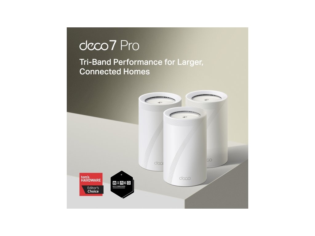 TP-Link Deco BE68 Špičkový mesh systém s technologií Wi-Fi 7, který přináší extrémní rychlosti až 14 Gb/s, nízkou latenci a stabilní pokrytí celé domácnosti. Díky 10Gb portu, pásmu 6 GHz a chytrému AI mesh řízení je připraven i na ty nejnáročnější sítě budoucnosti. Bezdrátová síť * Standard: Wi-Fi 7 (IEEE 802.11be) * Wi-Fi třída: BE14000 (Tri-Band) Rychlosti Wi-Fi: 6 GHz: až 8647 Mb/s, 5 GHz: až 4324 Mb/s, 2,4 GHz: až 688 Mb/s * Šířka kanálu: až 320 MHz (6 GHz) * Technologie: MLO, OFDMA, MU-MIMO (3×3), 4K-QAM, Multi-RUs * Antény: 8× interní vysokoziskové antény * Dosah: Mesh pokrytí celé domácnosti (TP-Link Mesh) Výkon a kapacita * Počet streamů: 8 * Kapacita sítě: Velmi vysoká – optimalizace pro mnoho zařízení * Backhaul: Bezdrátový i kabelový (lze kombinovat) * AI Mesh: Automatická optimalizace sítě podle prostředí Porty a hardware * Ethernet porty (na jednotku): 1× 10 Gb/s WAN/LAN, 1× 2,5 Gb/s WAN/LAN, 1× 1 Gb/s LAN * USB: 1× USB 3.0 (FTP, Samba, Media Server) * Tlačítka: Reset, WPS Režimy provozu * Režim routeru * Režim přístupového bodu (Access Point) Zabezpečení * Firewall: SPI Firewall * Šifrování: WPA, WPA2, WPA3-Personal TP-Link HomeShield: * Ochrana IoT zařízení v reálném čase * Blokování škodlivých stránek * Prevence útoků DDoS * Skenování domácí sítě * VPN: Server i klient (OpenVPN, PPTP, L2TP/IPSec, WireGuard) Software a správa * Aplikace: Deco App (iOS / Android) * Rodičovská kontrola: HomeShield – profily, časové limity, filtrace obsahu * QoS: Prioritizace zařízení * Cloudové funkce: OTA aktualizace, TP-Link ID, DDNS * Podpora protokolů: IPv4 / IPv6 Fyzické parametry * Rozměry (Š × H × V): 107,5 × 107,5 × 176 mm Obsah balení * 3-pack: 3× Deco BE68, 1× Ethernet kabel, 3× napájecí adaptér, stručný návod Provozní podmínky * Provozní teplota: 0 °C až 40 °C * Skladovací teplota: -40 °C až 60 °C * Provozní vlhkost: 10 % až 90 % RH * Skladovací vlhkost: 5 % až 90 % RH Odkaz na web výrobce: https://www.tp-link.com/uk/home-networking/deco/deco-be68/v1%20(3-pack)Dodatočné parametre