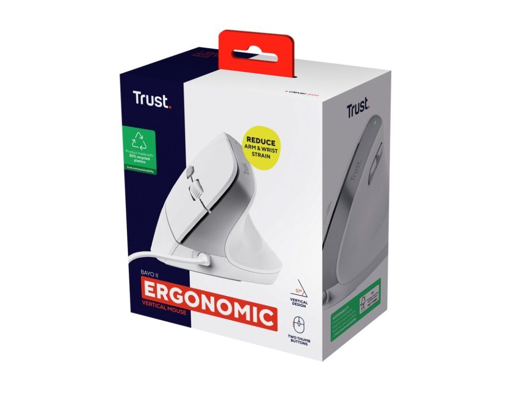 Trust Bayo II ergonomická myš s optimálním vertikálním úhlem pro snížení namáhání zápěstí * ergonomické vertikální provedení s optimálním 57° úhlem a pohodlnou opěrkou palce snižuje zátěž paže a zápěstí * vyrobeno z 50% z recyklovaných plastů * ''tichá'' tlačítka Technické parametry Rolovací kolečko: ano Počet tlačítek: 6 Programovatelná tlačítka: ne Rozhraní/konektivita: USB-A Délka kabelu: 1,5m Nastavitelné DPI: ano (800dpi - 2400dpi) Rozlišení senzoru: 800, 1200, 1600, 2400dpi Snímač pohybu: optický Barva: bílá Rozměry: 120×77×73mm Hmotnost: 121g Doporučené požadavky na systém: - volný port USB - Windows, macOS, Linux, Chrome OS Záruka: 2 rokyDodatočné parametre