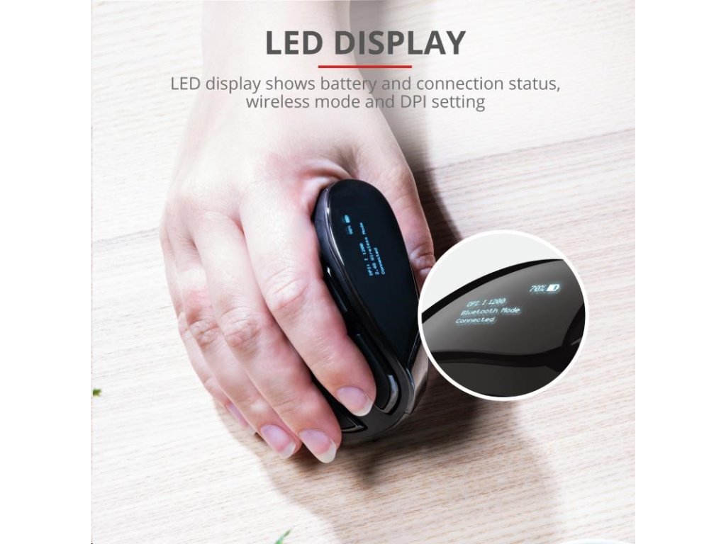 - LED displej zobrazuje stav batérie a pripojenia, bezdrôtový režim a nastavenie DPI