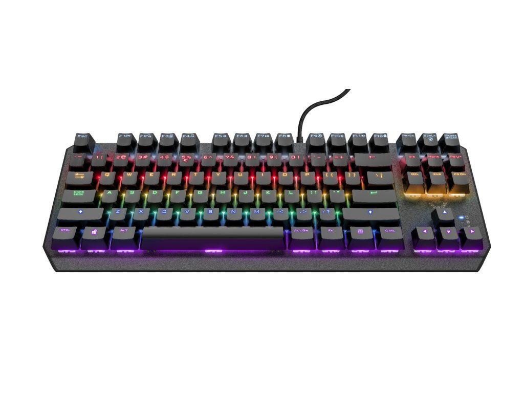 Kompaktní herní klávesnice bez numerického bloku s mechanickými spínači a duhovým podsvícením • Rychlé a citlivé mechanické spínače Outemu s životností až 50 milionů stisknutí kláves • Design bez numerického bloku, zabírá méně místa na stole • Díky technologii N-key rollover se stisknutí každého tlačítka projeví ve vaší hře • Podsvícení v podobě duhových vln, 6 barev s 20 režimy a nastavitelným jasem a rychlostí • 11 funkčních kláves, multimediální a herní/kancelářské funkce budete mít pod kontrolou • Kovová horní deska pro robustní herní zážitekDodatočné parametre
