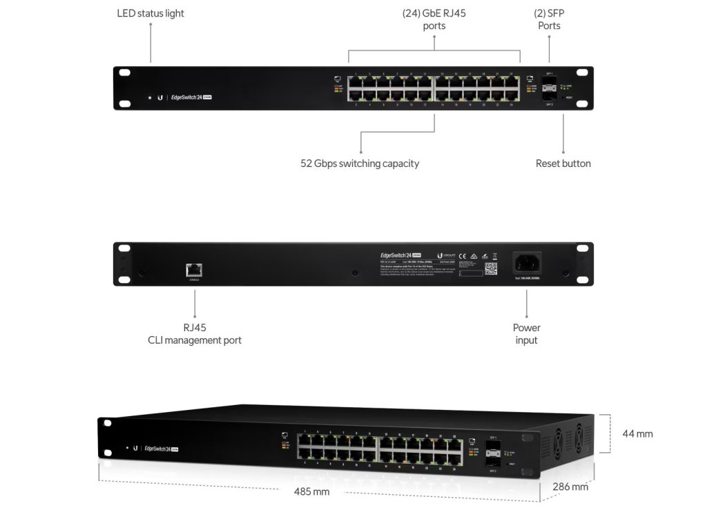 Ubiquiti EdgeSwitch PoE, 24x 10/100/1000, 250W PŘEHLED Gigabitový L3 PoE switch Ubiquiti EdgeSwitch ES-24-250W v 19'' rackmount provedení s maximálním výkonem PoE napájení 250W. Managovatelný switch s 24 gigabit metalickými porty + 2 gigabitové SFP porty a celkovou propustností 26Gbps. PoE na každém portu je možné nastavit jako aktivní PoE 802.3af/at nebo pasivně 24V s maximálním výkonem34W/port. SPECIFIKACE * 24x 10/100/1000 BaseT RJ-45 STP port * 2x SFP port - hot swap * Celková propustnost: 26Gb/s * 19'' Rackmount * Max. výkon: 250W * PoE: PoE+ 802.3at/af nebo pasivních 24V nastavitelné na každém portu, případně vypnuto (piny 1 a 2+ 3 a 6-) * PoE+: automatické rozpoznání 802.3at/af, výstupní napětí 50-57V, max. výkon 34,2W/port * Pasivní PoE 24V: manuálně konfigurovatelné, výstupní napětí 20-27V, max. výkon 17W/port * Napájení: 100-240V AC/50-60Hz * ESD/EMP ochrana: Air: ±24kV, Contact: ±24kV * Management: UniFi OS UniFi OS Console, CLI, IPv6 Management, SNMP v1, v2, a v3, SSH, SSL/TLS, SCP, Telnet * Provozní podmínky: -5 až + 40°C, vlhkost 5-95% (noncondensing) * 4 ventilátory * Rozměry (ŠxVxH): 485x44,45(1U)x285,6mm * Hmotnost: 3,7kg Obsah balení: * napájecí kabel * montážní racková sada * manuálDodatočné parametre