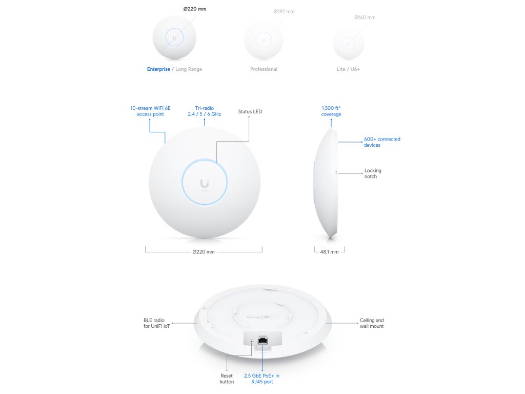 Ubiquiti U6-Enterprise, přístupový bod UniFi Access Point WiFi 6 Enterprise je vysoce výkonný triple-band WiFi 6/6E přístupový bod (2,4GHz, 5GHz a 6GHz) a je ideální AP do velmi vytížených míst jako jsou haly, sklady či kanceláře. * Podpora WiFi 6 (pásma 2,4/5/6GHz) * Celková propustnost 10,2Gb/s * Napájeno PoE+, podporuje standard 802.3at Technické parametry Bezdrátové frekvence: 2,4 + 5 + 6GHz (triple band) WiFi standardy: 802.11n, 802.11a, 802.11ac, 802.11b/g, 802.11ax Propustnost 2,4, 5, 6GHz: 573,5Mb/s, 4,8Gb/s, 4,8Gb/s Vysílací výkon 2,4, 5-7GHz: 22dBm, 26dBm 2,4, 5, 6GHz MIMO: 2x2 (UL MU-MIMO), 4x4 (DL/UL MU-MIMO), 4x4 (DL/UL MU-MIMO) Typ antény: vestavěná Šifrování: WPA, WPA2, WPA3 Počet vestavěných antén: 10 Zisk antény: 3,2dBi, 5,3dBi, 6dBi Síťová rozhraní: Ethernet (1x port 2,5GbE RJ45), Bluetooth Napájení přes PoE: 44 .. 57V DC Typy PoE: PoE-In (pouze) Max. spotřeba energie: 22W Použití: vnitřní Rozměry: 220x220x48,1mm Hmotnost: 960g (bez držáku) Obsah balení: * zařízení * kit na přichycení na strop/stěnu * sada šroubků a hmoždinekDodatočné parametre