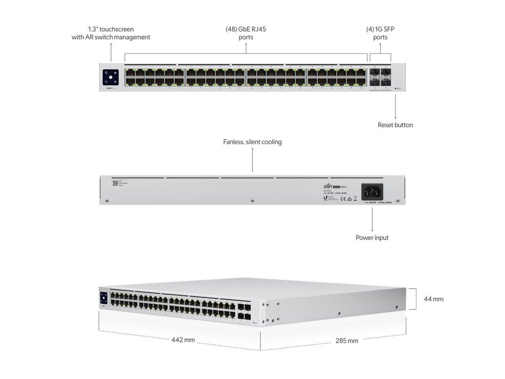UniFi Switch 48 je plně spravovaný přepínač vrstvy 2 s (48) porty Gigabit Ethernet a (4) 1G SFP porty pro optické připojení. UniFi Switch 48 nabízí bohatou sadu funkcí vrstvy 2 a tiché chlazení bez ventilátoru pro použití jako přepínač přístupové vrstvy. UniFi Network Controller a mobilní aplikace UniFi Network umožňují správcům konfigurovat a monitorovat prakticky všechny funkce přepínače v intuitivním grafickém uživatelském rozhraní odkudkoli. Funkce: (48) Gigabitové porty RJ45 (4) 1G SFP porty Funkce vrstvy 2 Tiché chlazení bez ventilátoru 1,3 "dotykový displej, podporuje UniFi Network AR Spravováno síťovým řadičem UniFi (5.13.10 nebo novější)