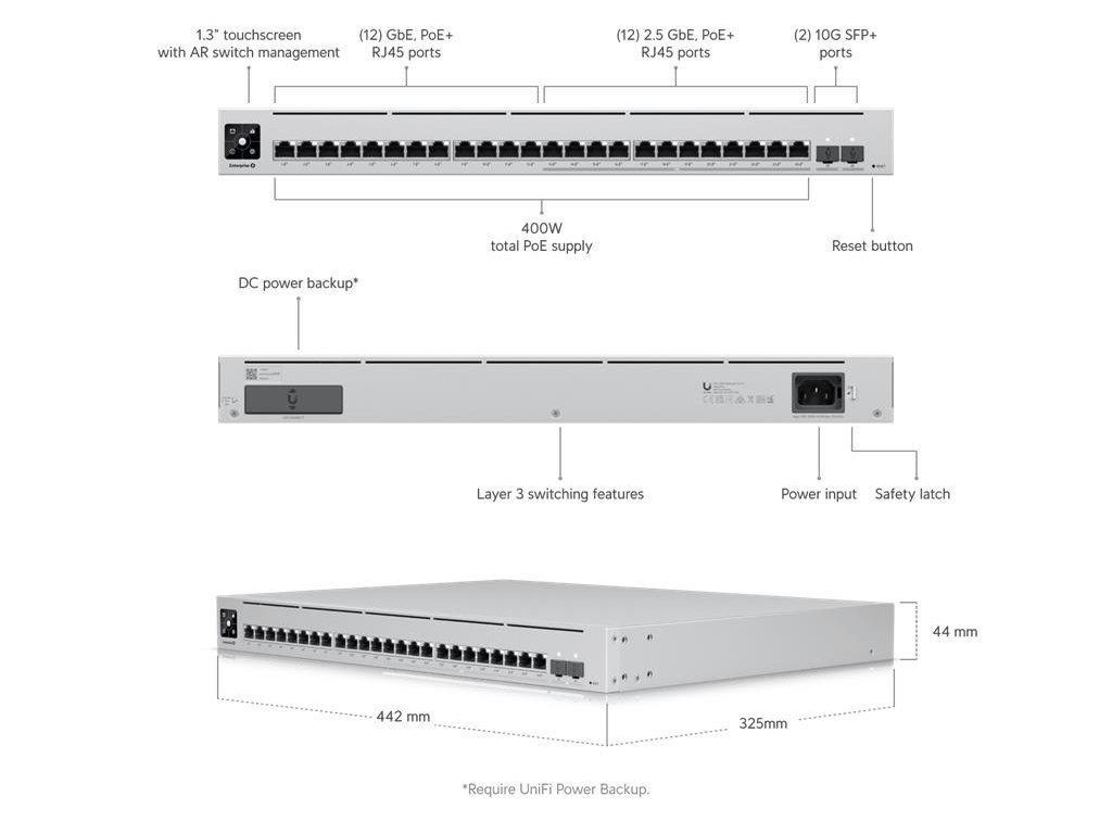 Zařízení umožňuje propojení na redundarní systém UniFi Smart Power Redundant Power system (USP-RPS) Managed Layer 3 switch with (12) 2.5G RJ45 ports with PoE+ for WiFi 6 APs, (12) Gigabit RJ45 ports with PoE+, and (2) 10G SFP+ ports for fiber uplinks.