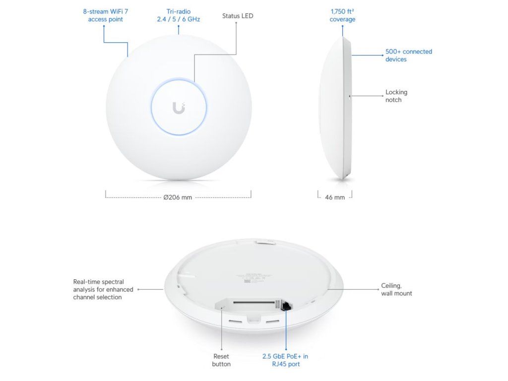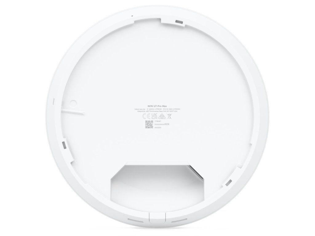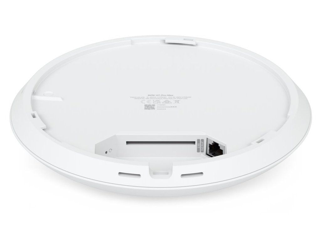 UniFi U7 Pro Max je designově povedené vnitřní hotspotové řešení využívající standard 802.11a/b/g/n/ac/ax/be. Je vybaveno anténním systémem MIMO 2×2 (2,4 GHz), MIMO 4×4 (5 GHz) a MIMO 2×2 (6 GHz) v podobě integrovaných antén se ziskem 4 dBi/ 6 dBi/ 5,9 dBi (2,4 GHz/ 5 GHz/ 6 GHz).