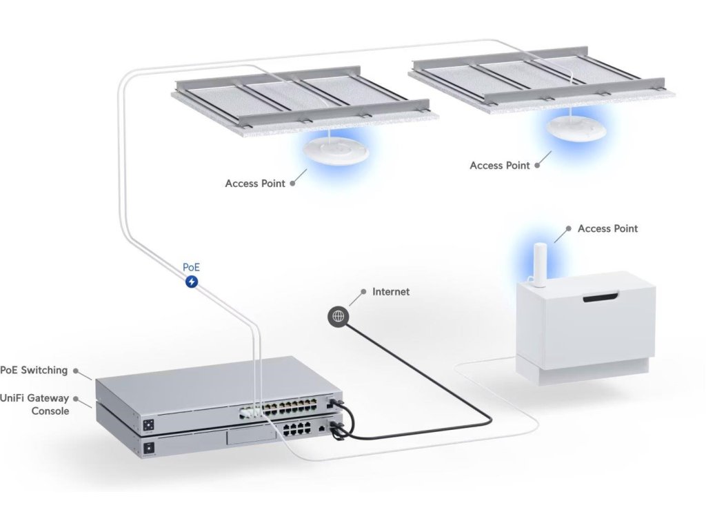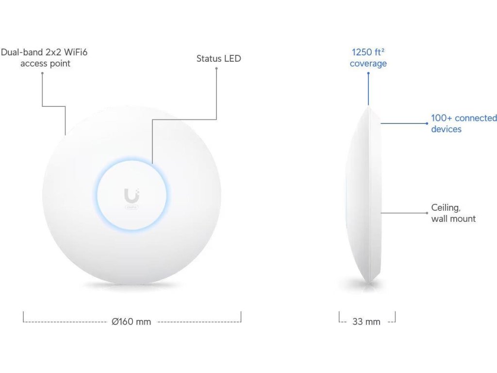 Popis produktu UniFi 6+ Access Point je základní Dual Band WiFi 6 AP (2.4GHz a 5GHz) do menších hal, skladů či kanceláří. U6+ je schopen dosáhnout skvělých propustností. V pásmu 5 GHz (2x2 MIMO) je to 2402 Mbps při použití 160 MHz šířkou pásma a ve 2.4 GHz (2x2 MIMO) je to 574 Mbps, což mu umožňuje podporovat více než 300 současně připojených klientů. Pro připojení do sítě má Access Point Gigabitový ethernet s podporou aktivního (802.3at) ale i pasivního (44 až 57V) PoE. Klíčové vlastnosti • Dual band WiFi 6, podpora 802.11a/b/g/n/ac/ax (WiFi 6) • 5 GHz propustnost až 2402 Mbps (2x2 MIMO) • 2.4 GHz propustnost až 574 Mbps (2x2 MIMO) • Anténní zisk - 2.4GHz (3 dBi) a 5GHz (5.4 dBi) • WPA/WPA2/WPA3 šifrování • Gigabitový LAN port • Napájení přes 802.3af nebo pasivní 44 až 57V PoE, spotřeba 9W • Podporováno UniFi Controllerem od verze 7.3.76 Centrální řízení jednotek Ke správě zařízení je potřeba stáhnout z oficiálních stránek originální software nazývaný UniFi Network Controller, díky kterému lze řídit celou síť. Nespornou výhodou UniFi Controlleru je, že je zcela zdarma bez jakéhokoliv omezení! Tento centrální management umožní nahrávat mapy a nastavit základní parametry i pokročilé funkce jako například SSID, guest účet, úvodní stránku, statistiky provozu i seznam a status asociovaných klientů vždy snadno a rychle. Výhody UniFi řešení • Fast Roaming - bezvýpadkový přechod mezi jednotlivými AP • Wireless uplink (hodí se tam, kam není možné dostat datový kabel) • Až 8 SSID • Detailní statistiky provozu • Guest síť • Load balance - udržování rovnoměné zátěže / přepínání klientů • Omezování rychlosti pro každé SSID Obsah balení • Zařízení • Kit na přichycení na strop/stěnu (plastový a kovový kulatý díl) • Sada šroubků a hmoždinek Technické parametry Bezdrátové vlastnosti Bezdrátové frekvence:2.4 + 5 GHz (dual band) WiFi standardy:802.11n, 802.11a, 802.11ac, 802.11b/g, 802.11ax Přenosová rychlost - 5GHz [Mb/s]:2402 Přenosová rychlost - 2.4GHz [Mb/s]:574 Vysílací výkon 2.4GHz [dBm]:23 Vysílací výkon 5GHz [dBm]:23 Šifrování:WPA, WPA2, WPA3 2.4GHz MIMO:2 x 2 5GHz MIMO:2 x 2 Typ antény:Vestavěná Počet vestavěných antén:4 Roaming:Ano Zisk antény [dBi]:3, 5,4 Konektory a rozhraní Rychlost LAN:(1) 10/100/1000Mbps Gigabit LAN:Ano Napájení Napájení přes PoE:802.3af, 44 .. 57V DC Typ napájení:PoE Typy PoE:PoE-In (pouze) Max. spotřeba energie [W]:9 Fyzické charakteristiky Provedení:Na zeď, Stropní Použití:Vnitřní Tlačítka:Reset Provozní teplota [°C]:-30 až 60 Hmotnost [g]:338 Šířka [mm]:160 Výška [mm]:33 Hloubka [mm]:160 Software Operační mód:Access Point Podpora IPv6:Transparentní (režim bridge) Výchozí IP adresa:192.168.1.20 Výchozí jméno a heslo:ubnt / ubntDodatočné parametre