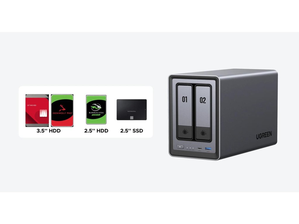 UGREEN NAS je kompatibilný s extrémne širokou škálou úložných diskov, vrátane 3,5„/2,5“ SATA diskov a M.2 SSD. Podporované sú všetky najobľúbenejšie značky pevných diskov a neexistuje žiadne obmedzenie na konkrétneho výrobcu.