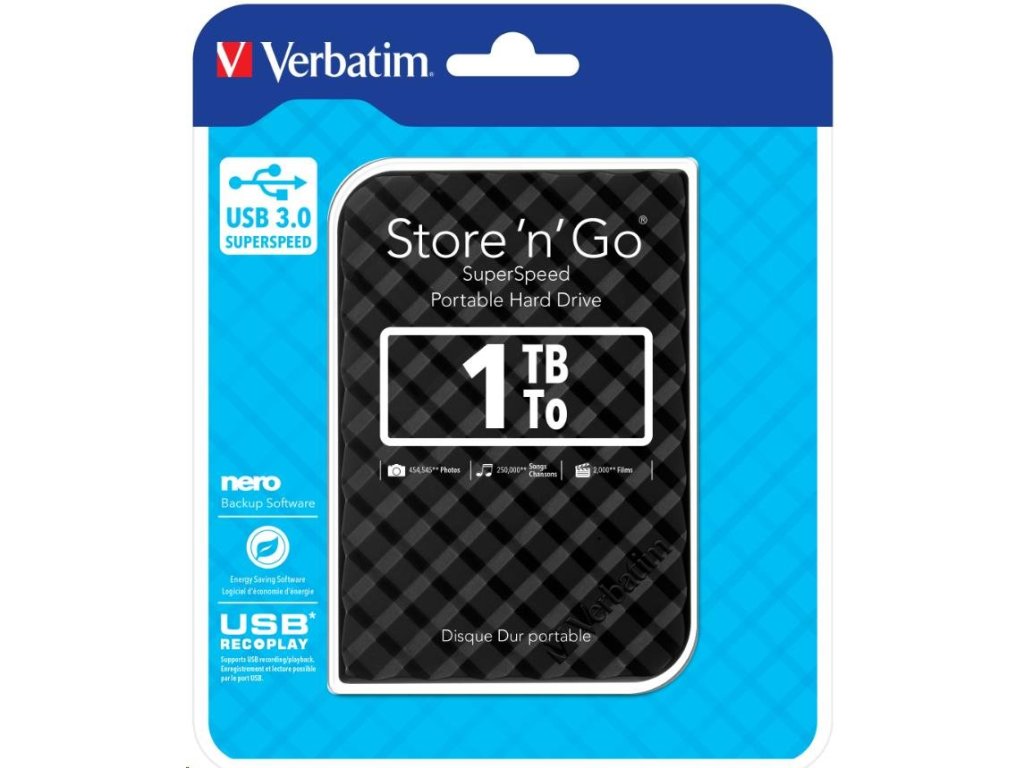 VERBATIM HDD 2.5" 1TB prenosný pevný disk Store 'n' Go USB 3.0, čierna Špeciálne funkcie: Dostupné farby: čierna, strieborná, biela, červená a modrá Dostupné kapacity: 500 GB, 1 TB a 2 TB Vysokorýchlostné úložisko s vysokou kapacitou. Rýchle a bezpečné riešenie na rozšírenie úložiska alebo zálohovanie súborov USB 3.0 SuperSpeed - pre veľmi rýchly prenos dát Nero Backup Software Softvér na úsporu energie USB REC & PLAY* - podporuje nahrávanie/prehrávanie cez USB 2 roky obmedzená záruka** Systémové požiadavky: PC alebo Mac s USB 3.0 Windows XP / Vista / Windows 7 a 8 Mac OS X 10.4 alebo vyššia Obsah balenia: Prenosný pevný disk / USB 3.0 Kábel / Nero Backup Software / Green Button Energy Saving Software / Verbatim Formatter / Quick Start Guide / User Guide (predinštalovaný na disku).Dodatočné parametre