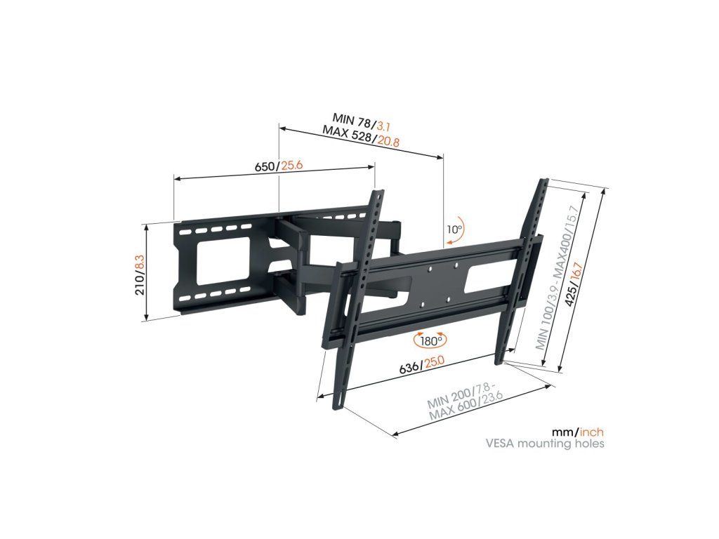 Spolehlivý držák s dvojitým ramenem a 4 klouby. Tento robustní nástěnný držák je vhodný pro televizory s úhlopříčkou od 40 do 77 palců. Snadno si poradí s televizory o hmotnosti až 35 kg. Umožňuje natáčení TV až o 180° a náklon dolů o 10°. Držáky z řady UP společnosti Vogel jsou nejen praktické, ale také kvalitní. Tento držák byl důkladně testován, aby vydržel co nejdéle. I při trojnásobné maximální hmotnosti televizoru zůstává držák bezpečný. Velmi důležité v rušné domácnosti! Další vlastnosti:Dodatočné parametre