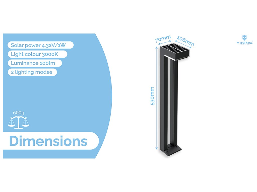 Svítivost 1000 lm • solární napájení • barva světla 3000K (teplá bílá) • 2 režimy osvětlení • doba osvětlení za nevhodných podmínek více než 10 dní • odolnost IP54 • kapacita baterie 3,7V/7,4Wh • výkon solárního panelu 4,32V/1W Venkovní solární LED světlo Viking SR07 Hledáte ideální osvětlení pro váš venkovní prostor? Venkovní solární LED světlo Viking SR07 je perfektní volbou, která spojuje moderní design, vysokou účinnost a dlouhou životnost. Toto sloupové světlo je nejen estetickým doplňkem, ale také praktickým řešením pro vaši zahradu, terasu nebo příjezdovou cestu. Klíčové vlastnosti: •Výkonné osvětlení: S intenzitou svícení 1000 lumenů a teplou barvou světla 3000K přináší Viking SR07 příjemnou atmosféru a dostatečné osvětlení pro jakýkoliv venkovní prostor. •Inteligentní režimy svícení: Vyberte si mezi dvěma režimy osvětlení podle vašich potřeb. Režim M1 poskytuje 100% svítivost po dobu 2 hodin a postupně snižuje intenzitu až na 20% do svítání, zatímco režim M2 udržuje 50% svítivost po celou noc. •Pokročilá solární technologie: Díky monokrystalickému solárnímu panelu s vysokou účinností nabíjení přes 21% se světlo nabije za pouhých 8,7 hodin, což zajistí provoz i za nepříznivých podmínek více než 10 dní. •Ekologické a úsporné: Viking SR07 využívá nejmodernější LED technologii s vysokou účinností 160 lm/W a baterii Li-ion, která zaručuje dlouhou životnost a nízké náklady na provoz. •Odolnost a spolehlivost: S krytím IP54 je světlo odolné proti prachu a stříkající vodě, takže ho můžete bez obav umístit venku. Navíc funguje v širokém teplotním rozsahu, což ho činí ideálním pro celoroční použití. Vyzkoušejte venkovní solární LED světlo Viking SR07! S vysokou svítivostí, inteligentními režimy, účinným solárním nabíjením a odolnou konstrukcí je Viking SR07 dokonalým řešením pro úsporné a ekologické osvětlení vašich venkovních prostor. Obsah balení: 2 ks - Venkovní solární LED světlo Viking SR07 2 ks - Bodák do země Technické specifikace světla: Model: Venkovní solární LED světlo Viking SR07 Svítivost: 1000 lm Barva světla: 3000K, Ra>70 Typ světla: LED (OSRAM) 2835, 4ks Doba osvětlení za nevhodných podmínek: >10 dní Režim ovládání: •tlačítko, zapnutí/vypnutí stisknutím na 1,5s Režim osvětlení: •M1: 100% (2H) + 80% (1H) + 60% (1H) + 40% (1H) + 20% do svítání •M2: 50% do svítání Indikace režimu: •Aktivace režimu M1: blikne jednou •Aktivace režimu M2: blikne dvakrát Technologie: ALS2.3 Ochrana: IP54 Rozměry: 53 x 10,6 x 7 cm Technické specifikace solárního panelu: Typ: Monokrystalický Výkon: 4,32 V/1 W Účinnost solárního nabíjení: > 21% Technické specifikace baterie: Typ baterie: Li-ion Kapacita: 3,7V/7,4Wh Teplota nabíjení/ vybíjení: 0~45°C/-20~60°C Doba nabíjení: 8,7 h Účinnost: 160lm/W Hmotnost celého produktu: 600gDodatočné parametre