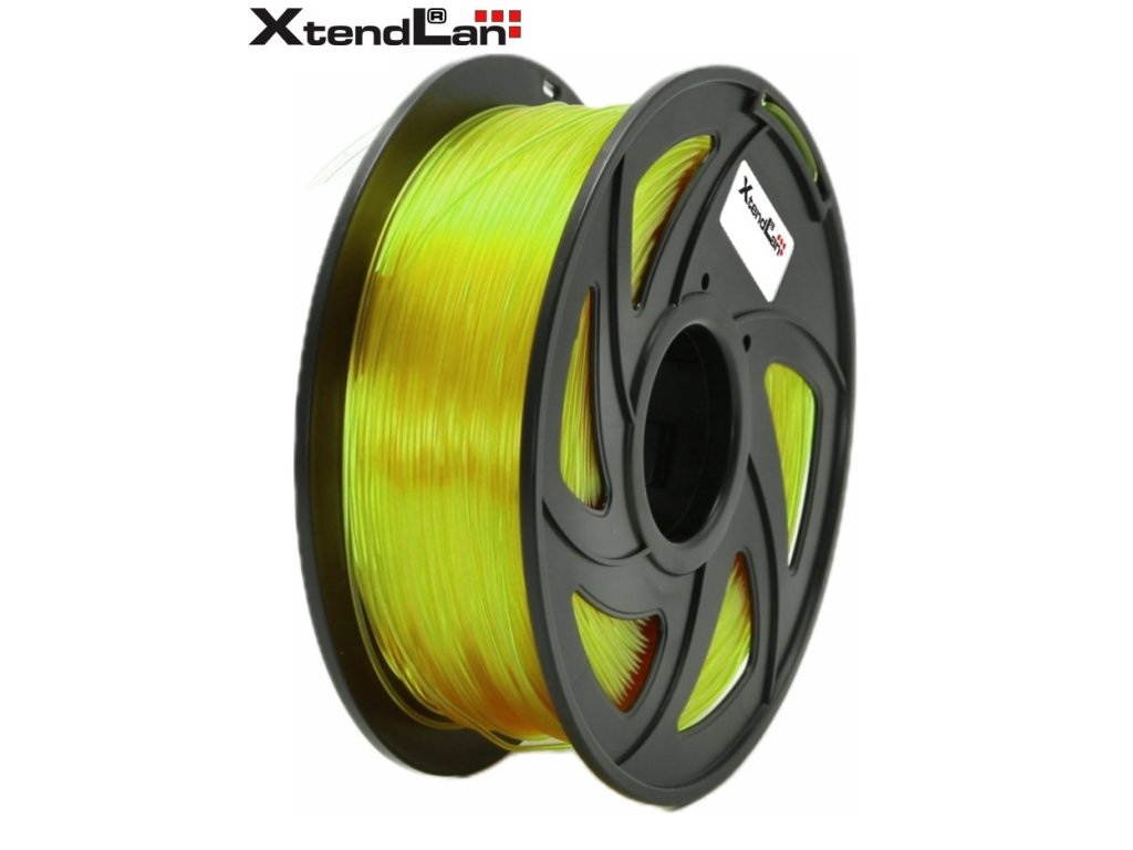 XtendLAN PETG filament 1,75 mm průhledný žlutý 1 kgPlastové vlákno (filament) pro 3D tisk, v návinu na cívce. PET-G (PolyEtylénTereftalát Glykolem modifikovaný) je materiál velmi známý díky plastovým lahvím. PETG v sobě spojuje to nejlepší z vlastností ABS a PLA pro 3D tisk. Jde o pevný a houževnatý materiál. Odolností se materiál blíží polykarbonátům. Vyznačuje se velmi malým tepelným smrštěním a je vhodný pro tisk i velkých objektů. Má velkou odolnost proti rozpouštědlům a kyselinám. Odolává vysokým i nízkým teplotám. Při 3D tisku má velmi dobrou přilnavost k podložce. Vytištěný předmět lze tepelně leštit. Filament je chráněný vakuovým balením a v každém balení je přítomen vysoušecí sáček, který zabraňuje případnému působení vlhkosti na materiál. Dodáváno v kartónovém obalu s okénkem pro kontrolu barevnosti.