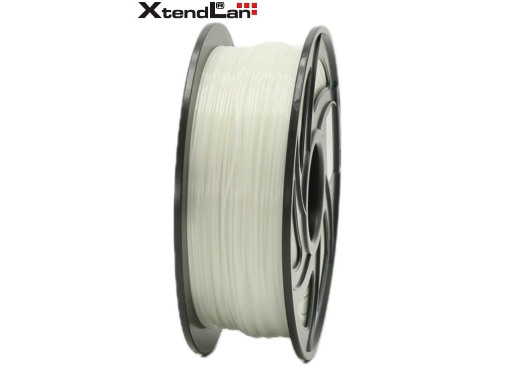 XtendLan PLA filament 1,75 mm průhledný bílý/natural 1 kgPlastové vlákno (filament) pro 3D tisk, v návinu na cívce. PLA (PoLylactic Acid, kyselina polymléčná) je nejpopulárnější 3D tiskový materiál. Především se při jeho tisku neuvolňuje nepříjemný zápach a není problémem tisk na neohřívanou podložku. Je rozměrově stabilní s velmi malým tepelným smrštěním a je vhodný pro tisk i velkých objektů. Jde o biologicky odbouratelný materiál. Není vhodný do vlhkého prostředí. Při 3D tisku má velmi vhodnou přilnavost k podložce - nepotřebuje, aby podložka byla ohřívána a zároveň lze výrobek snadno z podložky sejmout. Vytištěný předmět lze ručně brousit a lakovat. Filament je chráněný vakuovým balením a v každém balení je přítomen vysoušecí sáček, který zabraňuje případnému působení vlhkosti na materiál. Dodáváno v kartónovém obalu s okénkem pro kontrolu barevnosti.
