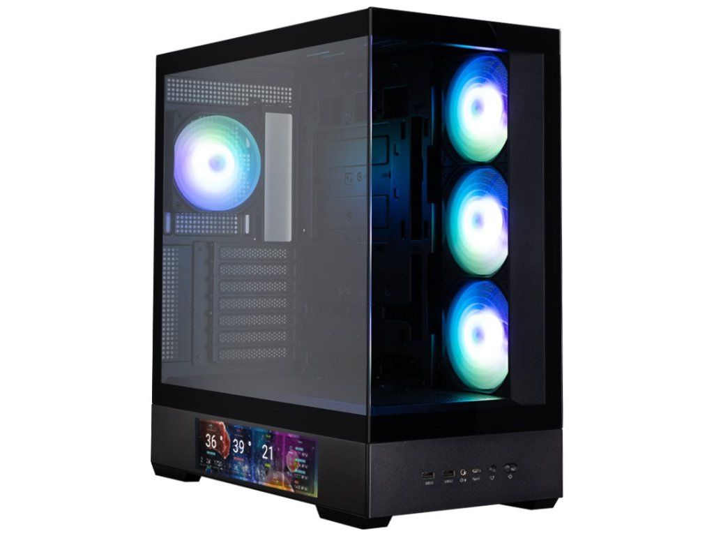 Prémiová ATX Middle Tower skříň s integrovaným 9" LCD displejem a bezrámovými skleněnými panely.