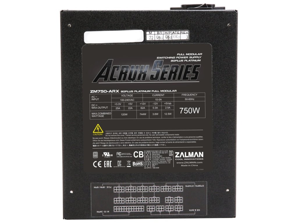 ZALMAN ZM750-ARX 750 WNapájecí zdroj o výkonu 750 W je osazen tichým, 135 mm velkým ventilátorem. Modulární kabeláž ušetří cenné místo ve skříni. Účinnost zdroje je 80PLUS Platinum.